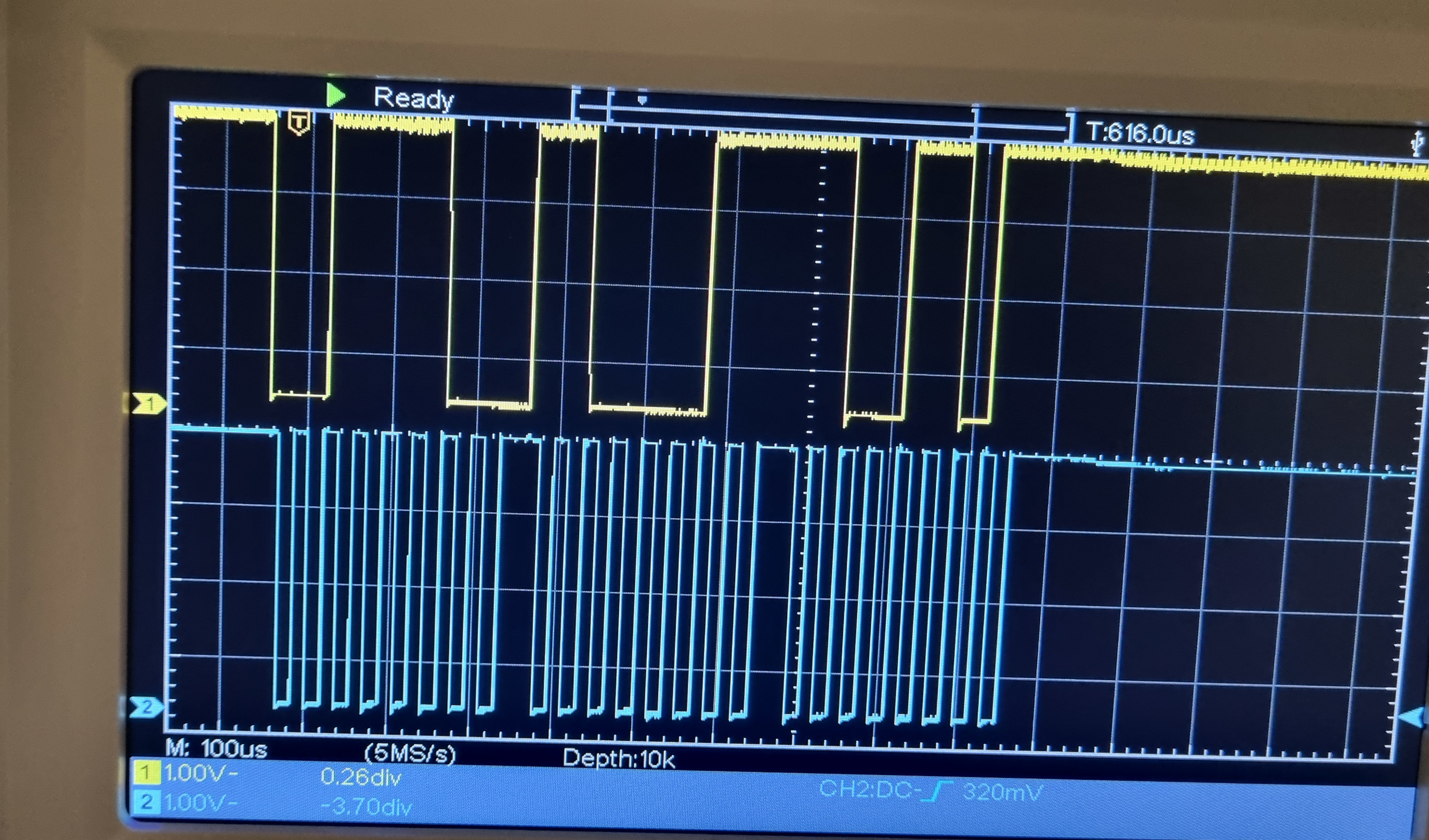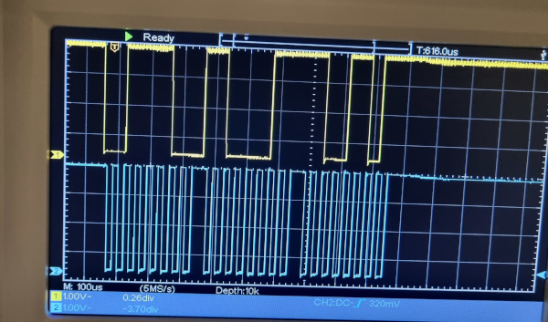 But first I need to get samples of the serial data leaving the 8748 micro controller. I set up the original clock and connected up my oscilloscope to the two pins on the controller and took some sample waveforms of the clock pulses and the data. The yellow trace is the data and the blue trace the clock pulse.