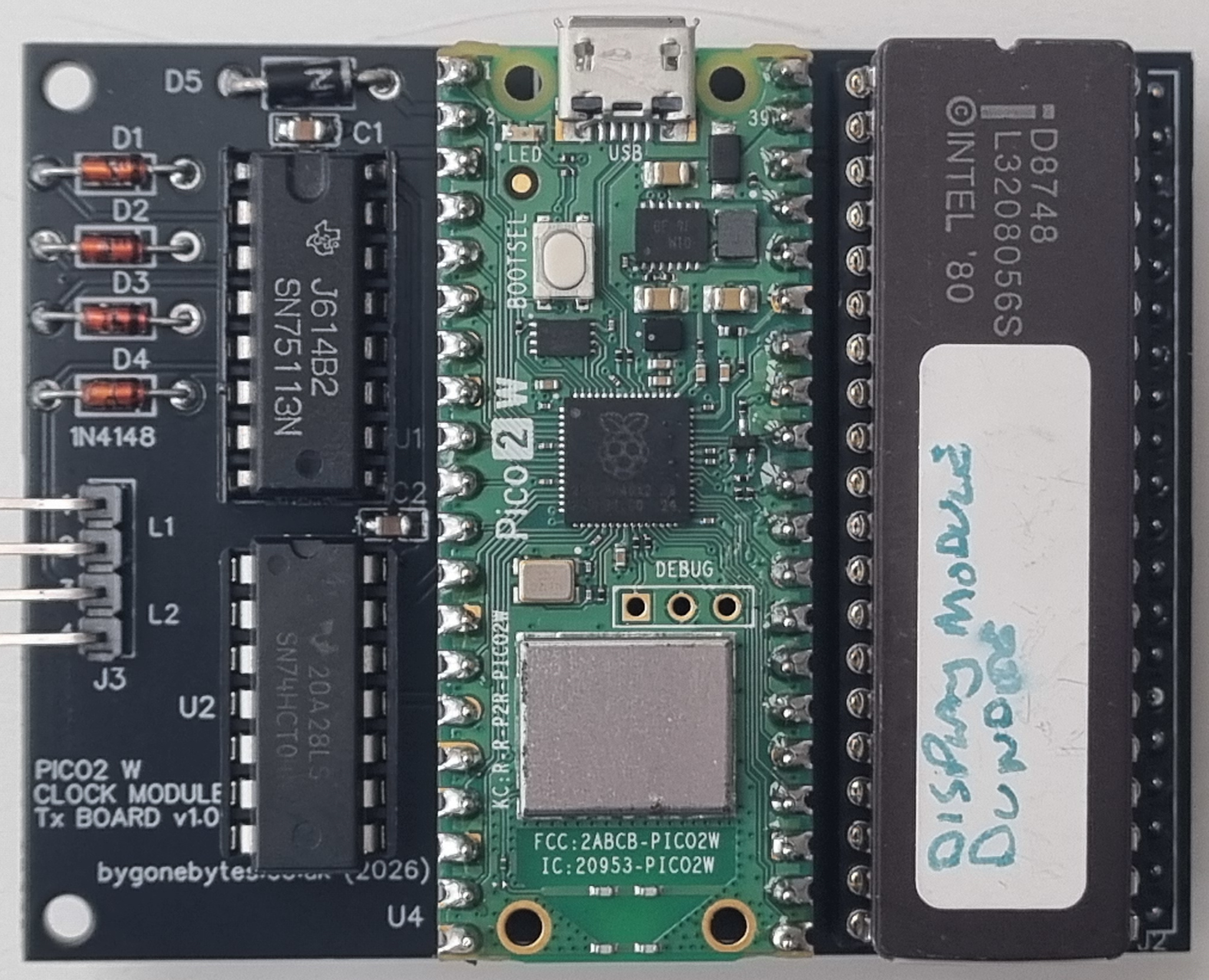 So my intention is to use a Raspberry Pi Pico 2W to do the time keeping and transmission to the clock modules. The 8748 Microcontroller currently providing this function will return to being a simple display module with a Pico module replacing the piggy back daughter board on the main clock. See my workshop clocks page from 2021.