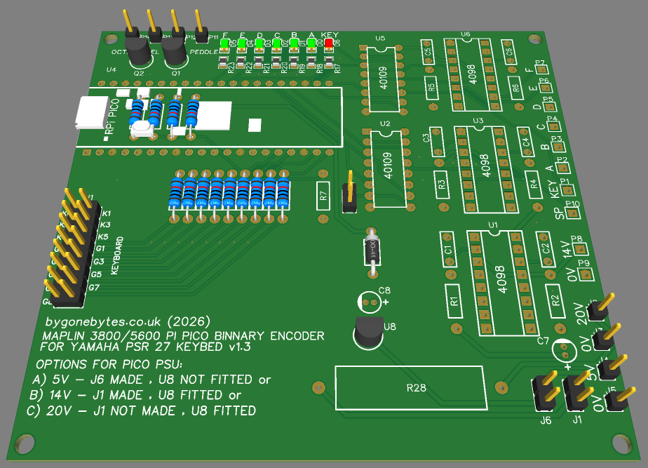 The Binary Encoder emulation includes the six 300uS pulsed Data outputs, the Keydown output and the Foot Peddle input. I have also kept my addition of the ocative switch which moves the entire keyboard up one octave. The software is ready and the PCB is in production.